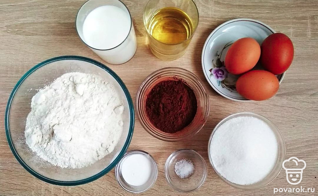 Подготовьте все необходимые ингредиенты. Просейте отдельно муку и какао-порошок. Сливочное масло заранее достаньте из холодильника, оно должно быть комнатной температуры. Желатин залейте холодной водой и оставьте набухать.