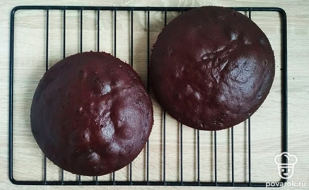 Вылейте тесто в две одинаковые формы диаметром 18-20 см, дно которых застелено пергаментом. Выпекайте при температуре 180С примерно 20 минут. Готовые бисквиты полностью остудите, при необходимости срежьте верхушки и разрежьте на коржи.
