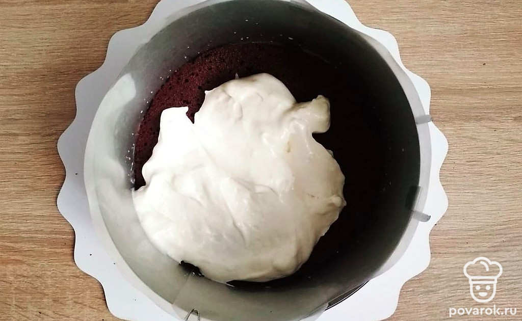 Соберите торт. Установите кондитерское кольцо на блюдо или подложку, слегка промазанную кремом для большей устойчивости торта. Выложите первый корж и пропитайте его сгущенным молоком, разведенным в кипяченой воде. Налейте часть мусса из белого шоколада.