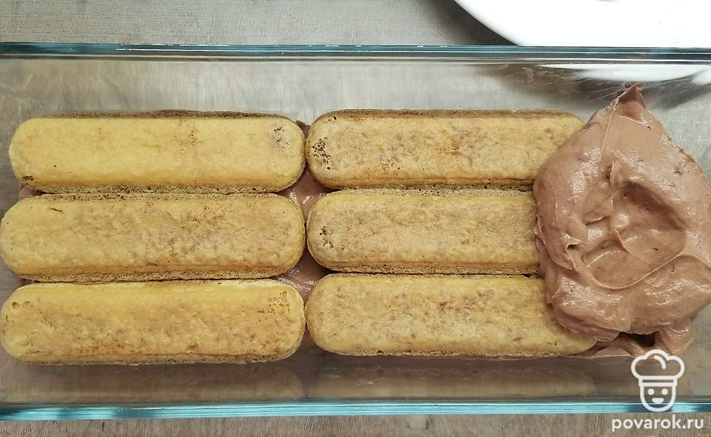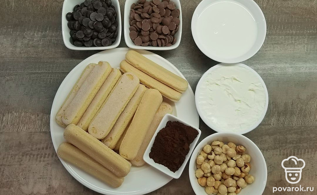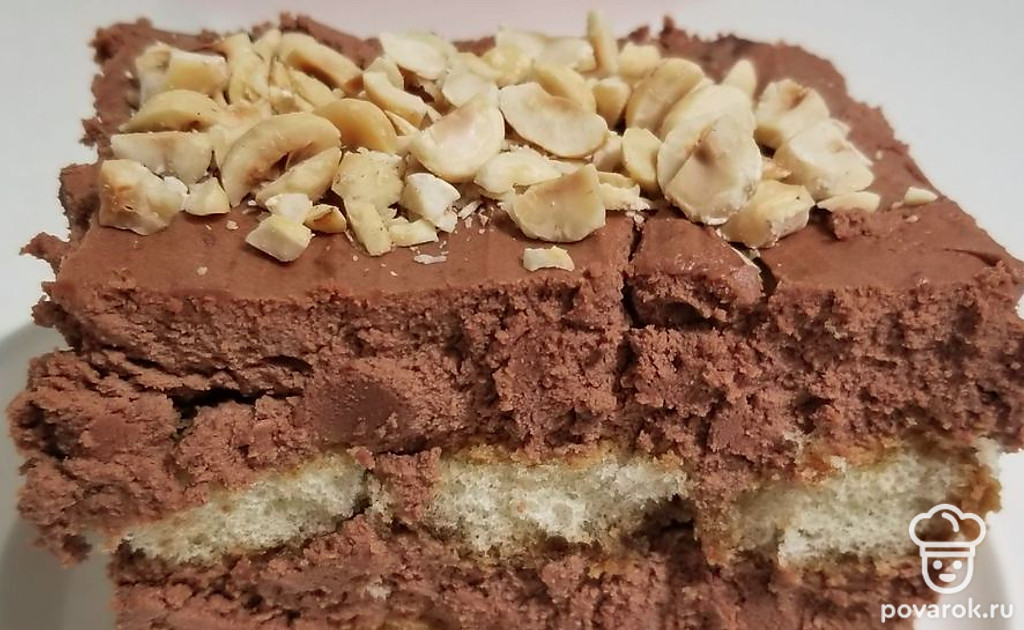 Печенье савоярди, или «дамские пальчики», известное многим, как основной и незаменимый компонент десерта тирамису, может быть использовано не только для приготовления одного лишь тирамису. Нежное хрустящее печенье прекрасно подходит для приготовления простого, но очень вкусного слоеного торта, особенностью которого можно считать нежный крем из маскарпоне и растопленного шоколада. Готовится такой крем очень легко, но благодаря насыщенному шоколадному вкусу и тающей текстуре делает этот торт очень необычным и ароматным. Посыпка из лесных орехов добавляет в торт ореховый вкус и хрустящие ноты.