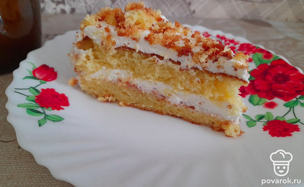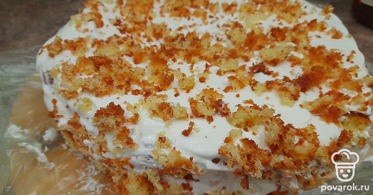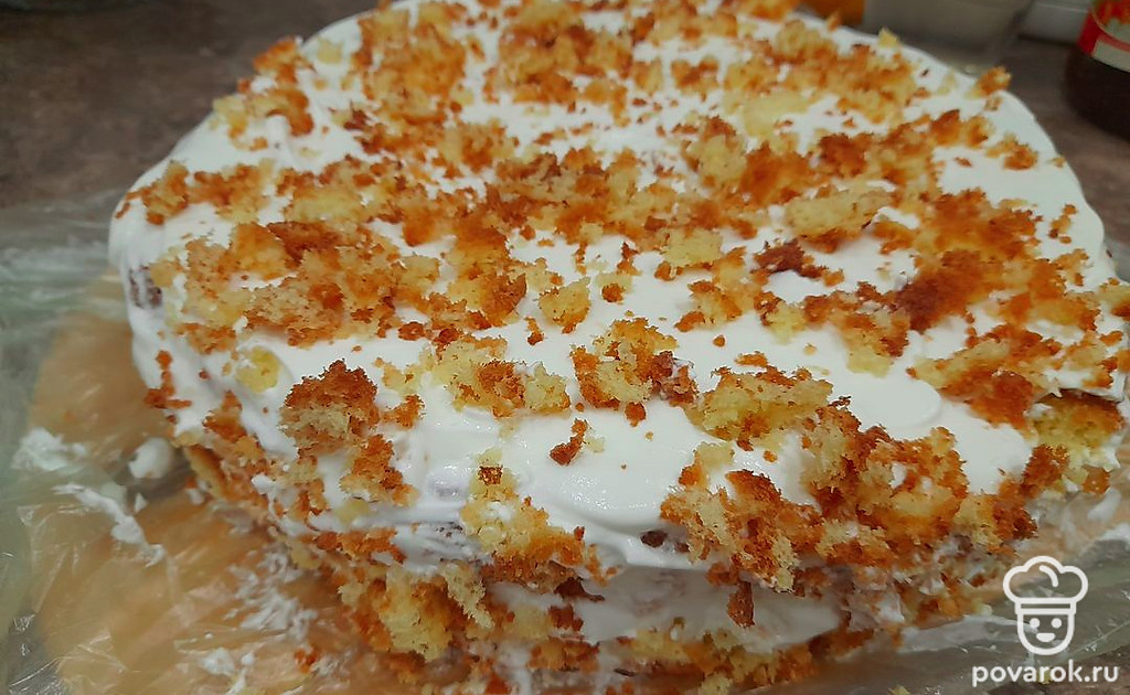 Поверх крема на готовом торте можно посыпать крошки бисквита, оберните плёнкой и поставьте в холодильник на час.