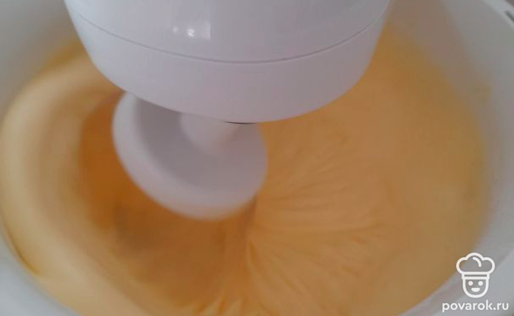 Свежие яйца начните взбивать на медленной скорости миксера. Добавьте 1 стакан сахара и ванилин и увеличьте скорость. Сахар добавляйте не весь сразу, а постепенно. Продолжайте взбивать около 5-7 минут до увеличения и побеления массы.