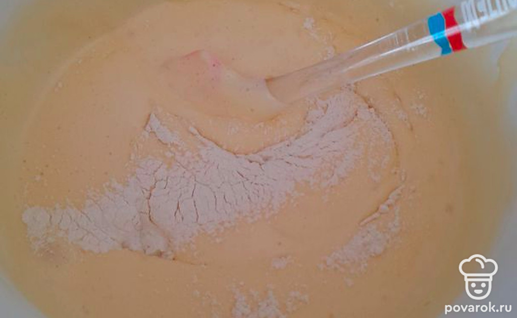 Добавляйте просеянную муку в 3 приема, каждый раз перемешивая тесто лопаткой методом складывания снизу-вверх. Так у вас получится воздушный бисквит.