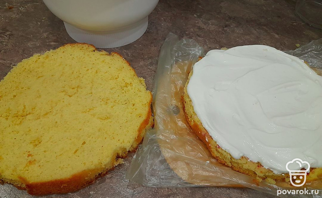 На разрезанный бисквит распределите крем.