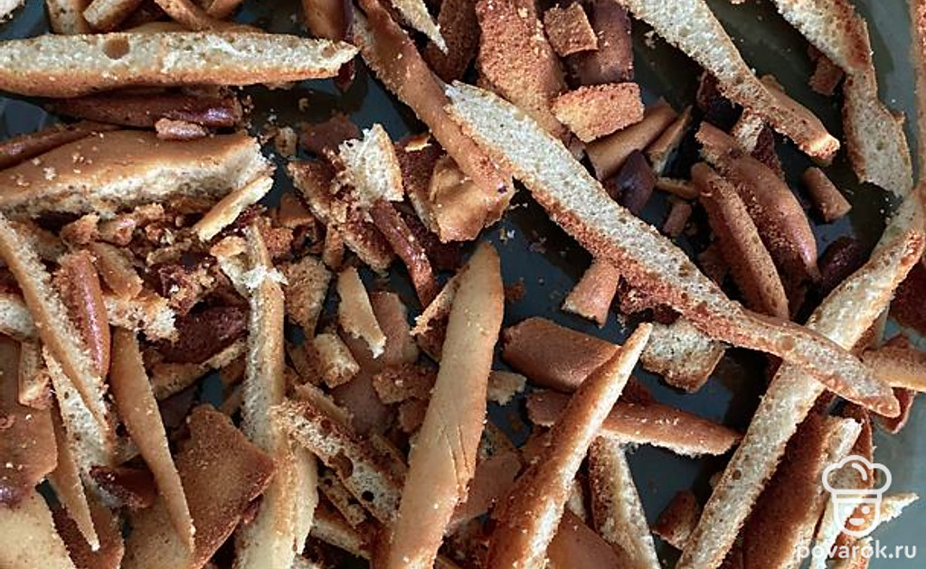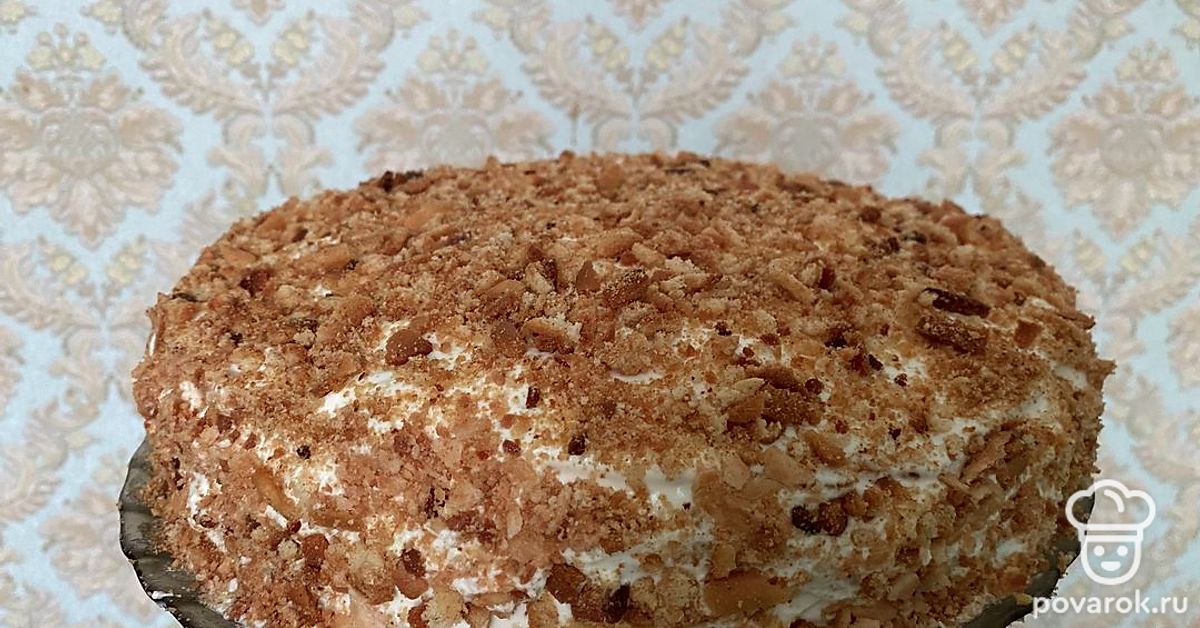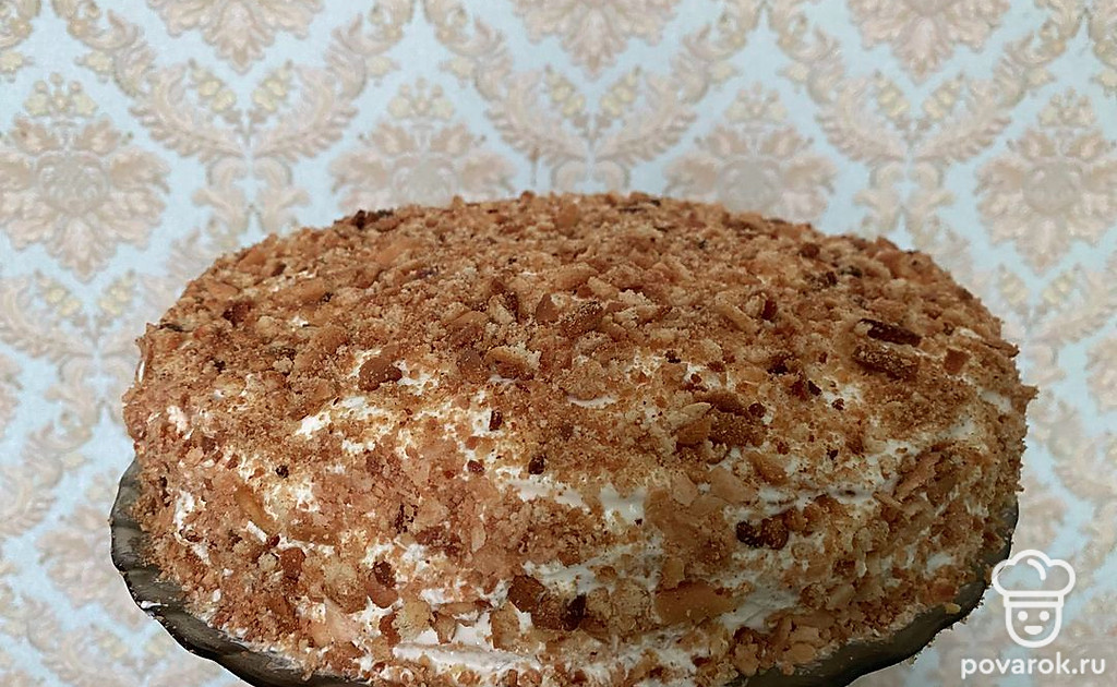 Оставшиеся обрезки от коржей измельчаем в блендере. Сожно соединить их с измельченными грецкими орехами. Полученной смесью со всех сторон обсыпаем наш медовый тортик.