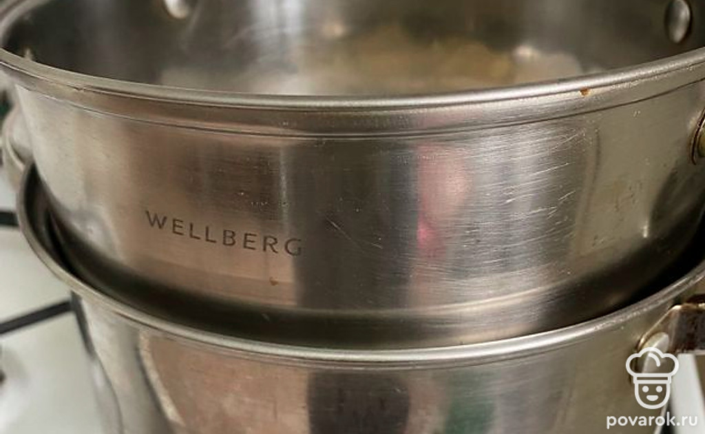 Первым делом соорудим водяную баню. Это делается очень просто и никакого специального оборудования не требуется. Берем две кастрюли разного диаметра. В большую кастрюлю наливаем воды, в нее ставим кастрюлю поменьше (маленькая кастрюлька не должна касаться дна большой). Всю эту конструкцию ставим на огонь.