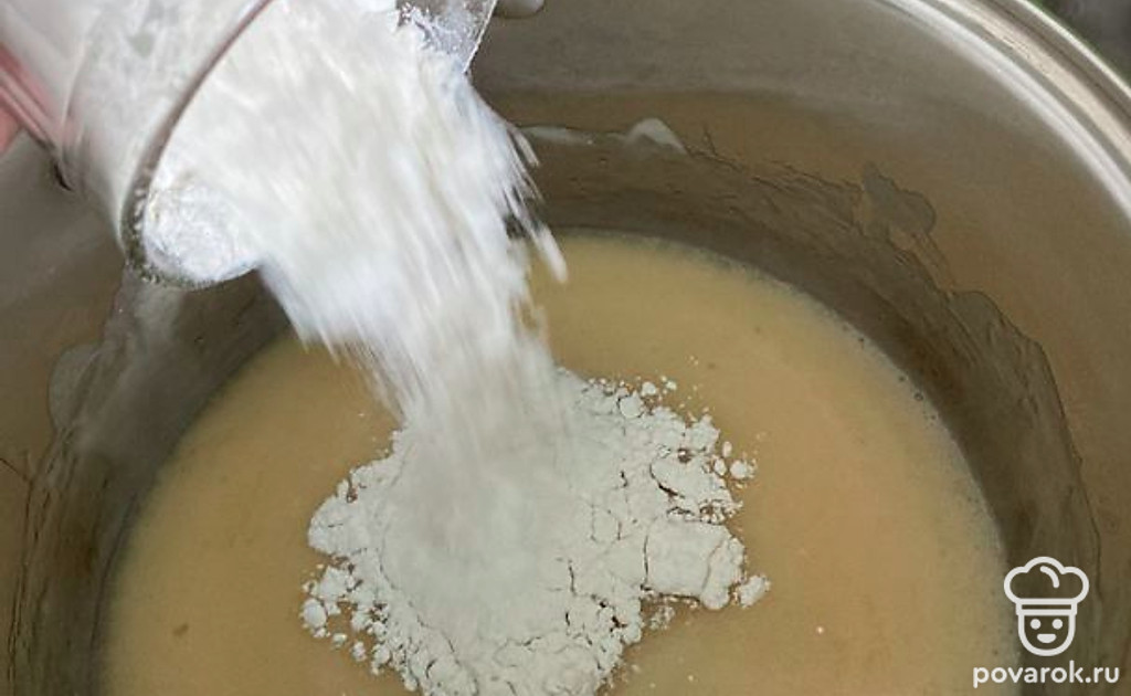 Помешивая, порциями добавляем муку. Обычно медовая масса хорошо берет муку, без образования комочков.