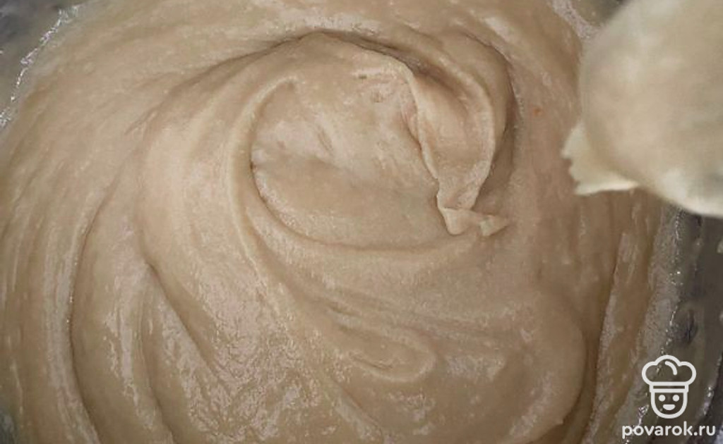 Все как следует перемешиваем, пока не получим однородную массу. Тесто для Медовика получается желтое, ароматное и тягучее, на фото это хорошо видно. По консистенции оно чуть более плотное, чем тесто для шарлотки.