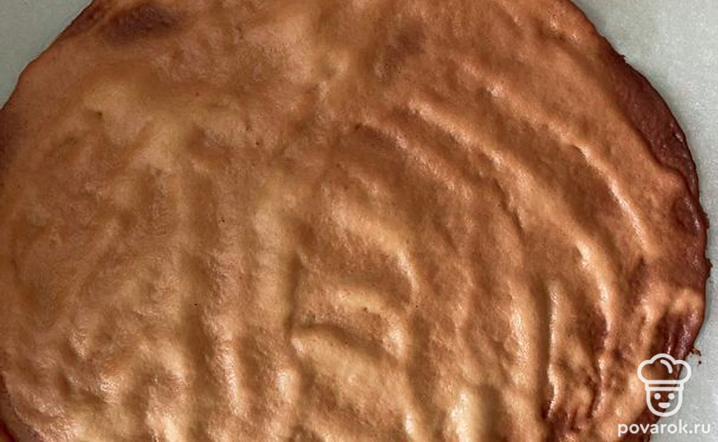 Противень с коржом ставим в предварительно прогретую духовку. Корж выпекаем до готовности при температуре 170-180 градусов, ориентировочно 5-6 минут. Время выпечки зависит от духовки и толщины коржа.