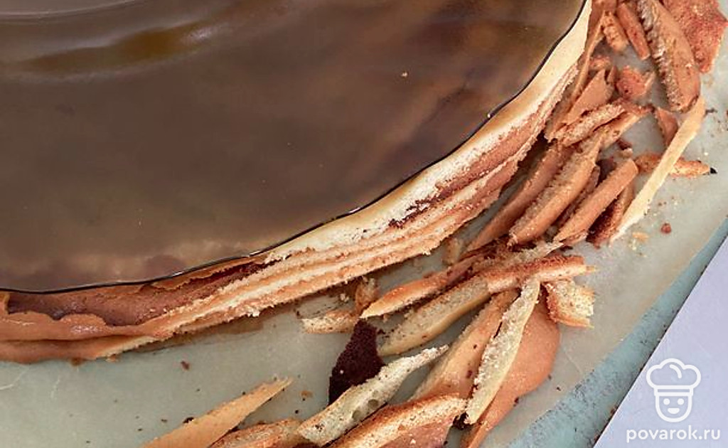 После первого коржа, отправляем в духовку второй и так далее. Готовые коржи раскладываем на столе, чтобы остывали (стопкой не складываем). Сразу же чуть остывший корж ровняем по нашему трафарету, тогда наш тортик получится ровненький и красивенький. Обрезки складываем, они нам пригодятся для обсыпки.