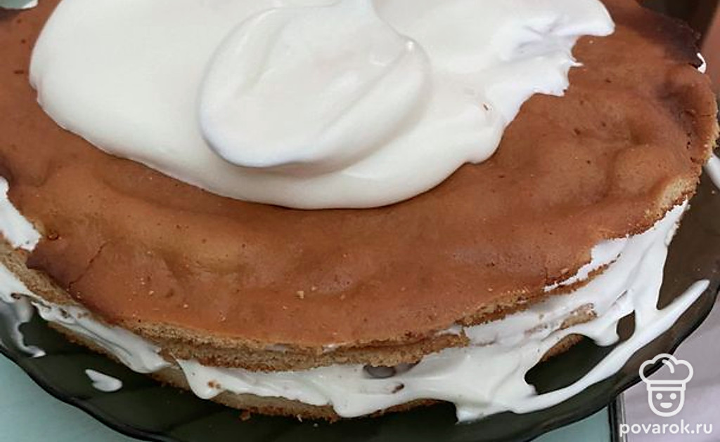 Остывшие медовые коржи обильно перемазываем сметанным кремом.