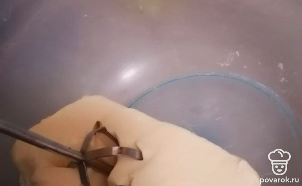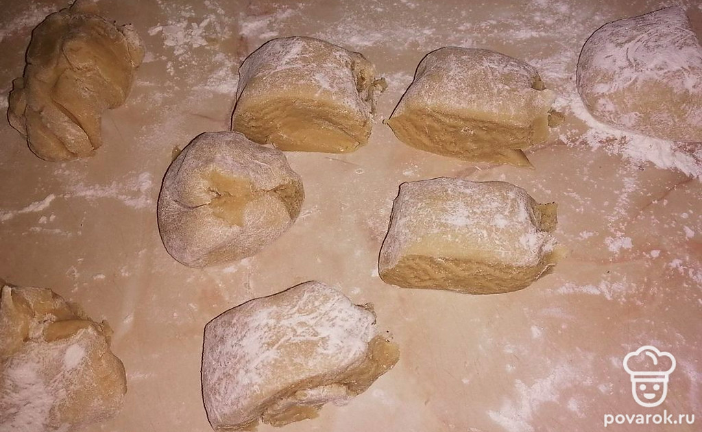 Как замешали тесто, катаем колбасу толстую и делим на 8 частей.