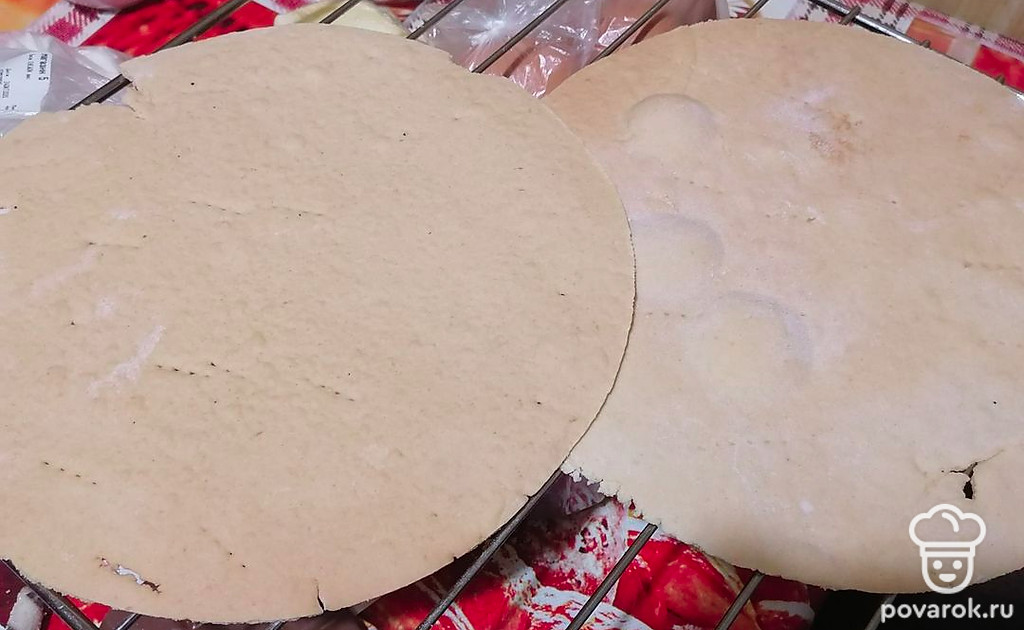 Отправляем в разогретую до 200 градусов духовку, как положили корж, температуру снижаем до 180 градусов. Каждый корж прокалываем вилкой. Печь корж 5-7 минут.