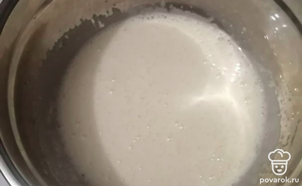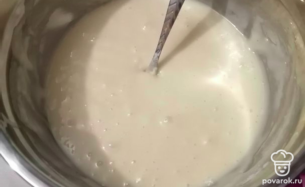 Добавляем 200 г сметаны и соду, гашеную уксусом, перемешиваем. Постепенно добавляем просеянную муку.