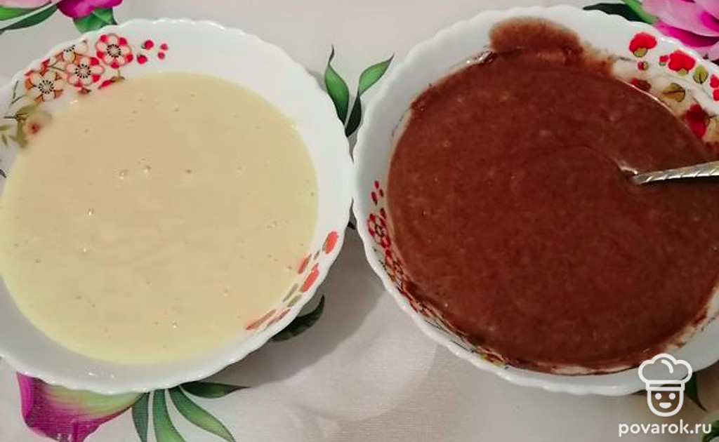 Делим тесто на две равные части, в одну добавляем какао и перемешиваем.