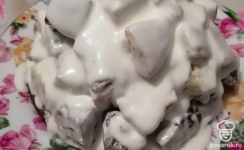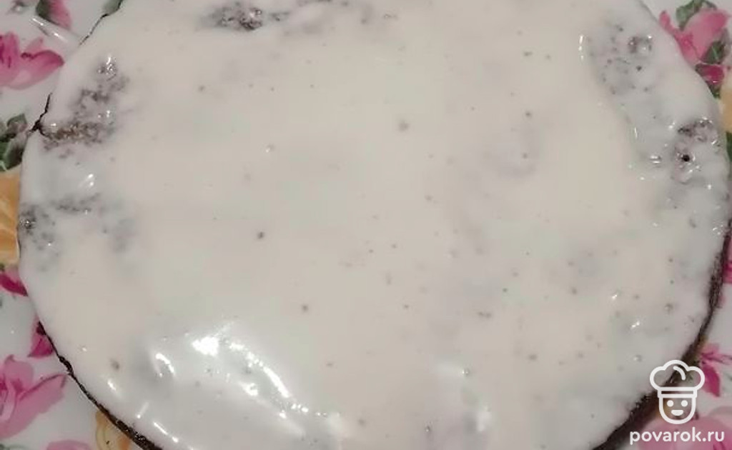 Нижний слой поливаем пропиткой из воды и сахара. Готовим крем, для этого взбиваем сметану и сахар до полного растворения сахара. Наносим крем на корж.