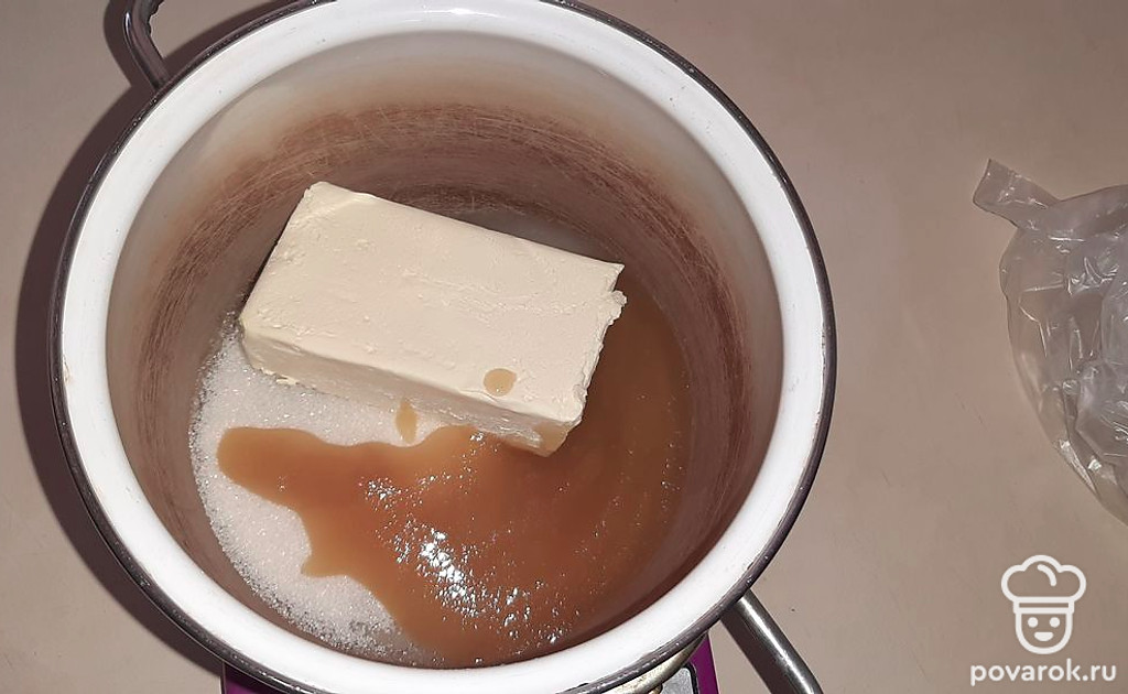 Сначала заводим тесто для коржей. Смешиваем в чистой таре сливочное масло, сахар и мед. Ставим все на средний огонь и доводим до лёгкого кипения.