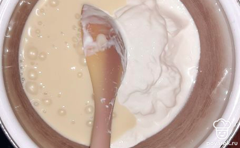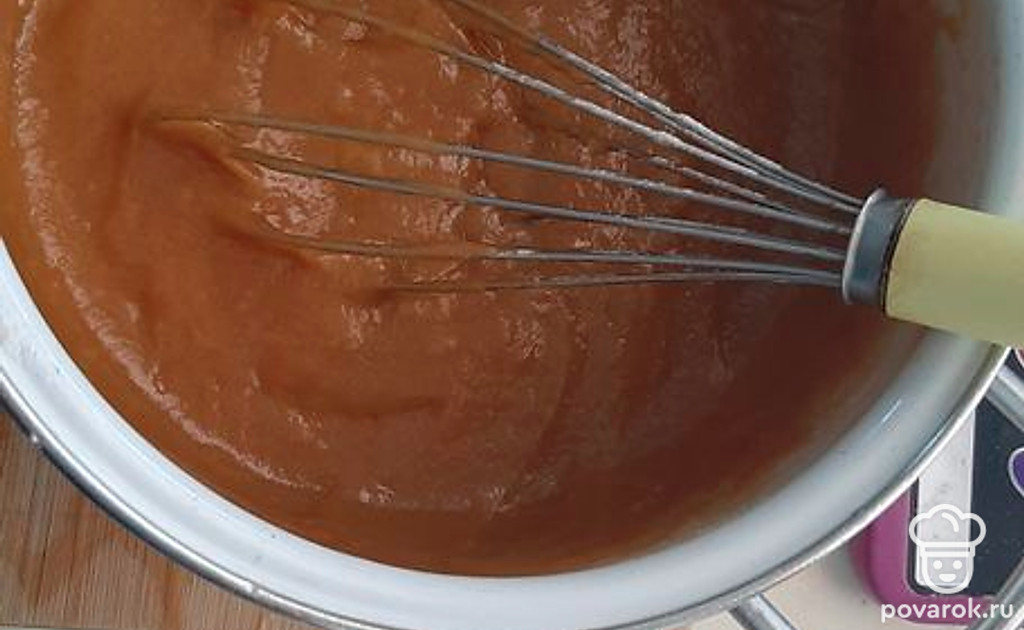 Массу остужаем и добавляем 2 яйца и муку, вымешиваем жидкое тесто.