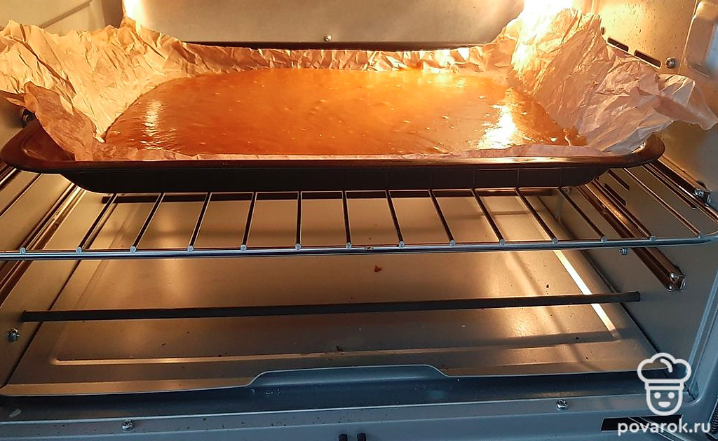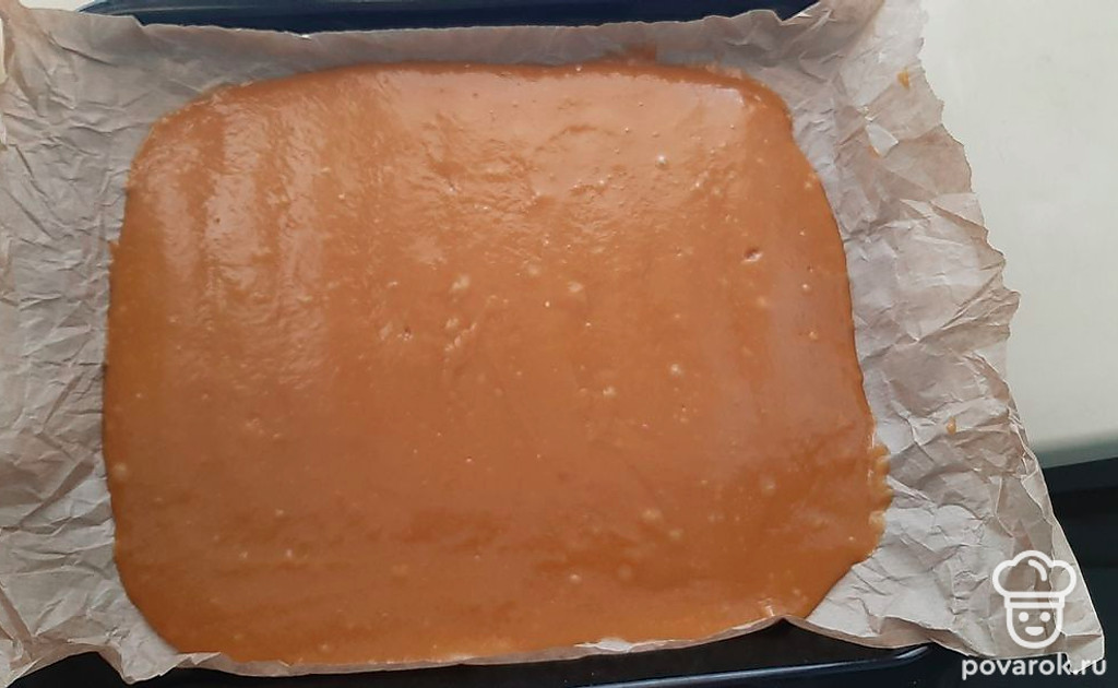 Выливаем тесто на противень, застеленный пергаментной бумагой.
