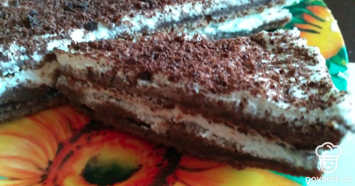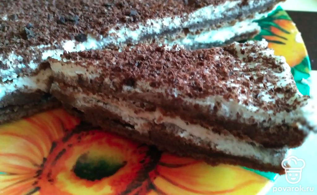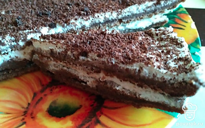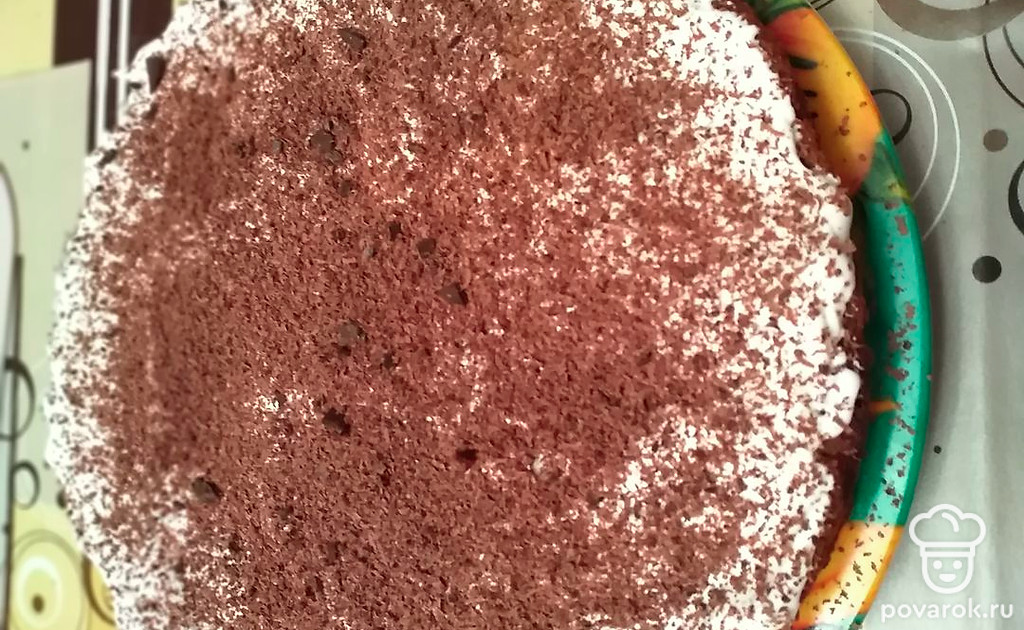 Сверху натираем плитку шоколада для украшения, убираем готовый торт в холодильник на ночь.