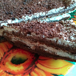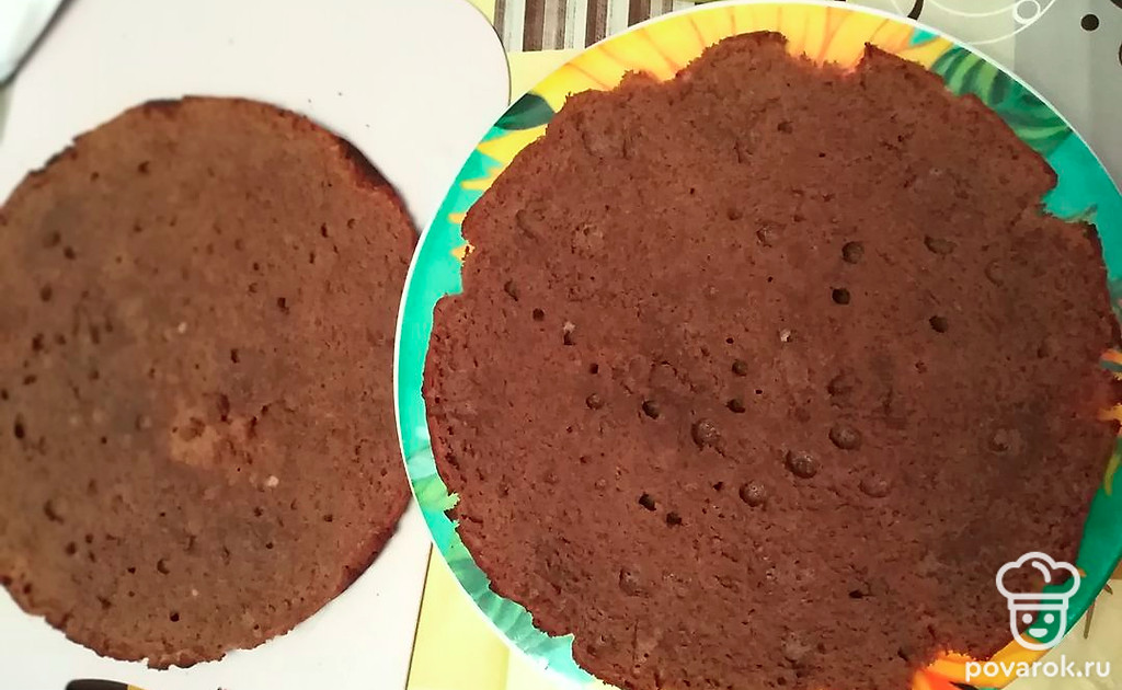 Готовый бисквит остужаем и разрезаем на 2 части.