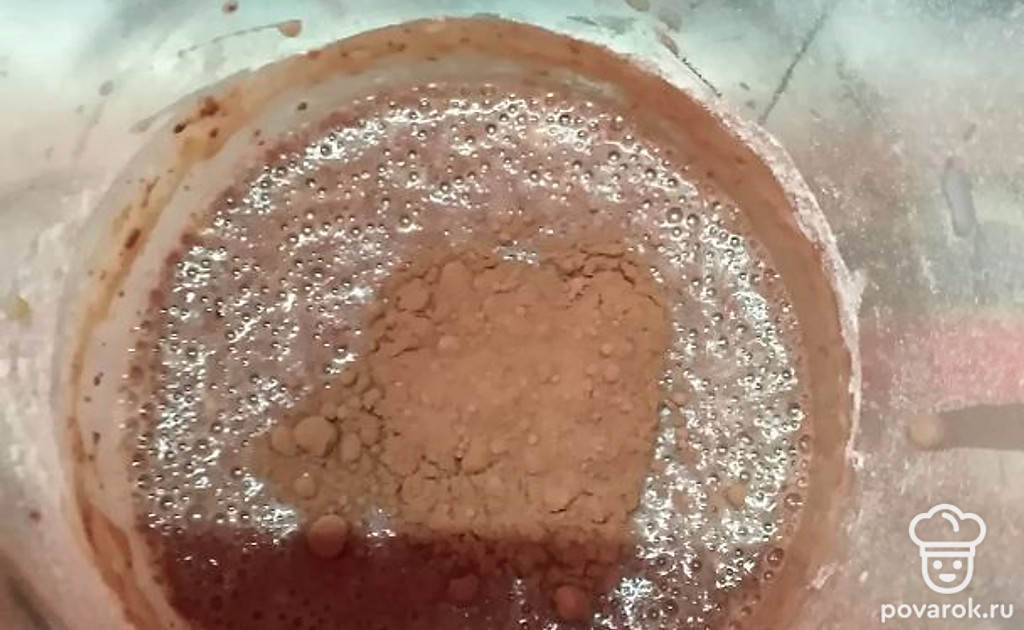 Замешиваем тесто. Взбиваем яйца с сахаром до бела, добавляем муку, разрыхлитель, какао, вливаем молоко.