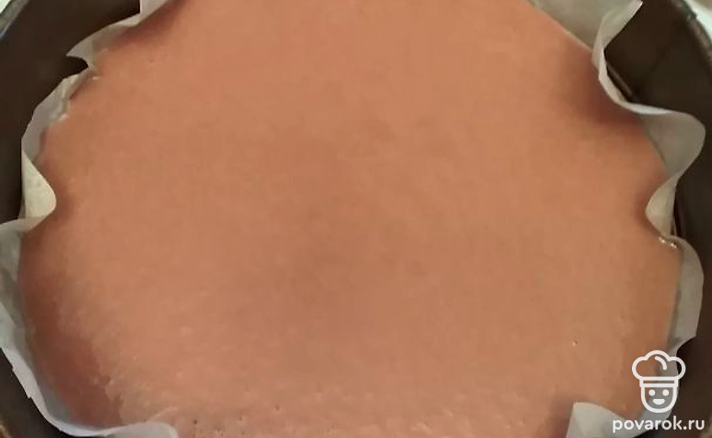 Форму для запекания застилаем бумагой для выпечки, выливаем тесто и ставим в разогретую до 150 г духовку до полной готовности бисквита (примерно 25минут).