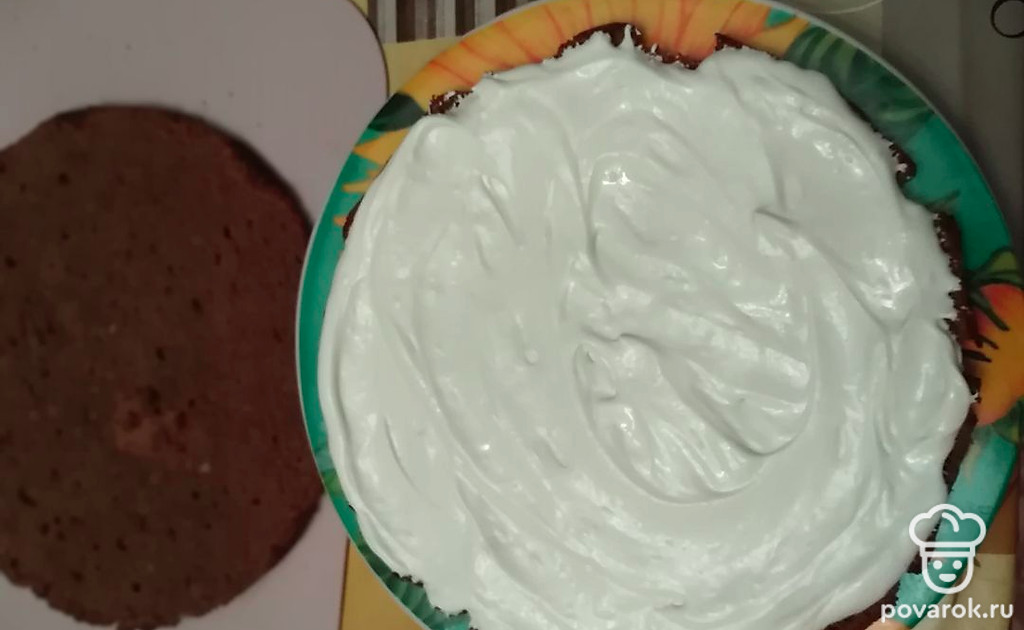 Готовим крем. Взбиваем охлажденные 33% сливки до густоты, вводим в них сахарную пудру (по вкусу) и творожный сыр. Собираем торт, хорошо промазывая пышки кремом.