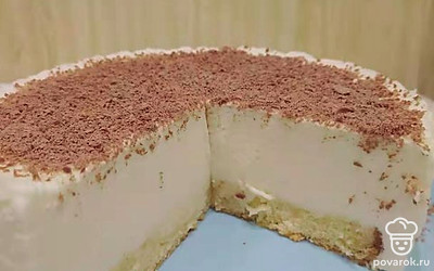 Бока разъемной формы выложить ацетатной пленкой. На дно формы выложить бисквит. Можно использовать для торта 1 или 2 коржа, по вашему желанию. На бисквит вылить суфле.