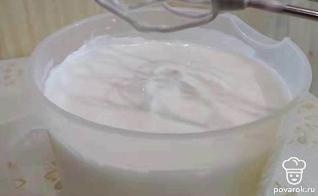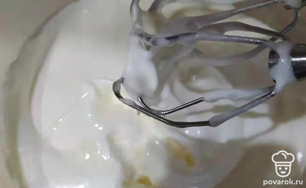 Взбить белки до легкой пены со щепоткой соли, добавить половину сахара и взбивать на максимальной скорости до крепкой пены, до устойчивых пиков.