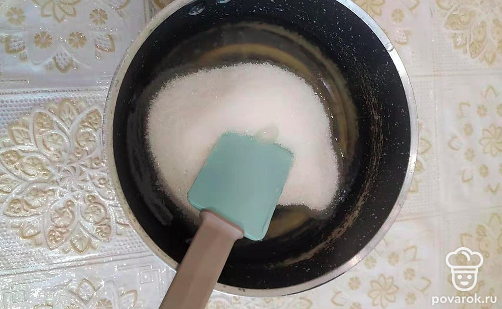 Набухший желатин смешать с оставшейся частью сахара и, помешивая, нагреть в кастрюле на медленном огне. Не кипятить!