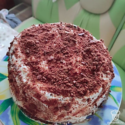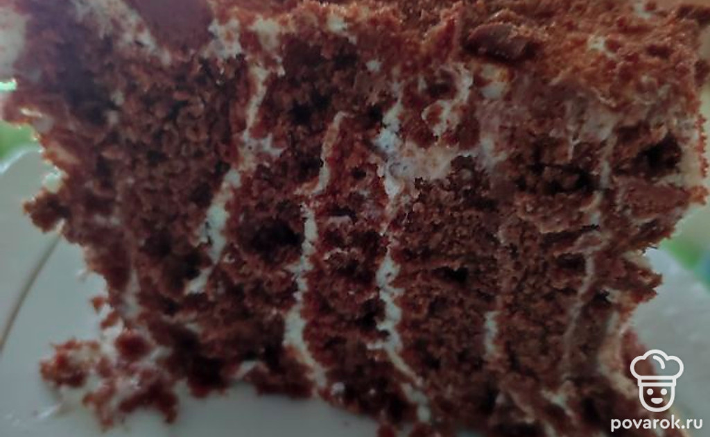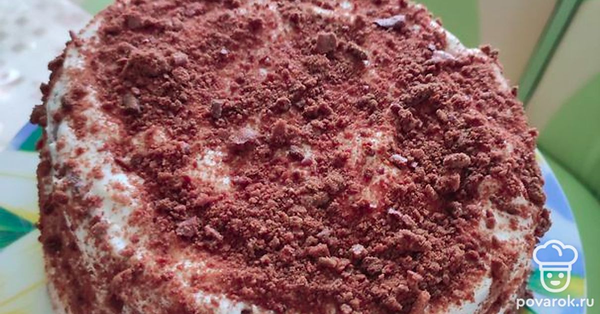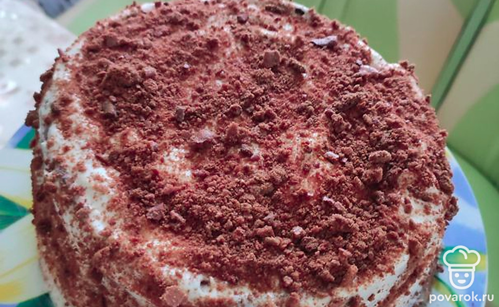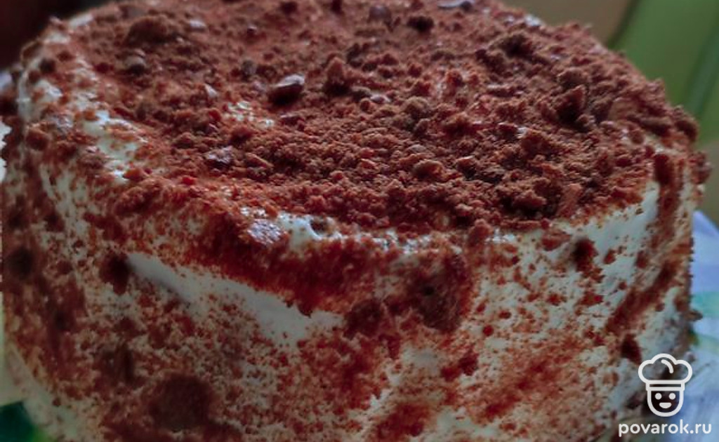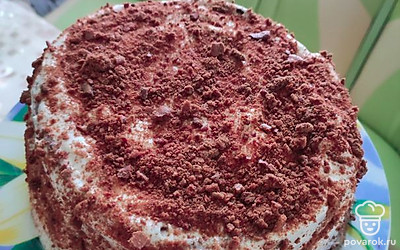 Измельчаем обрезки от коржей в крошку. Смазываем бока и вверх тортика оставшимся кремом. Сверху посыпаем крошкой. Убираем в холодильник на 10 часов.