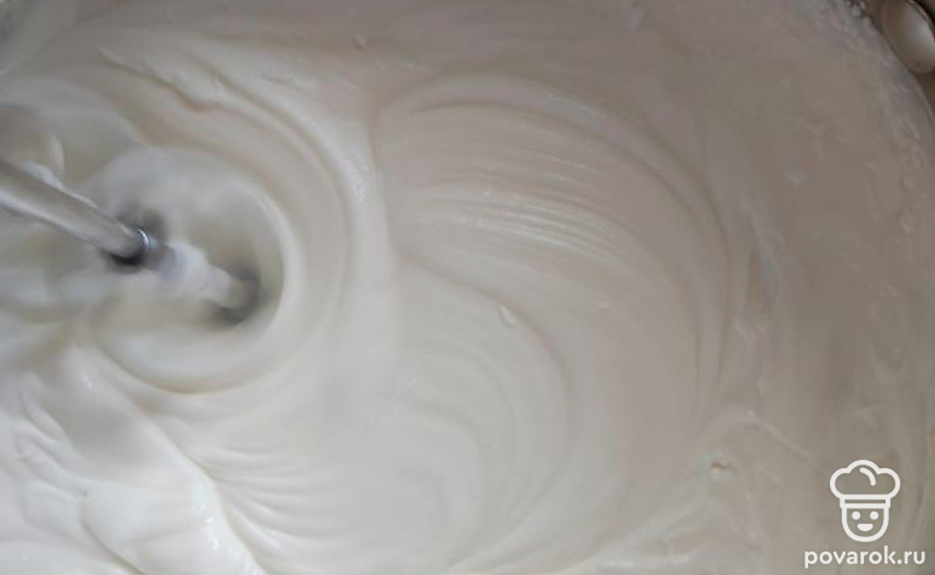 Для крема сливки холодные взбиваем с сахарной пудрой до устойчивых пиков. Добавляем сметану, аккуратно перемешиваем лопаткой.