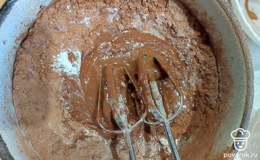 А кастрюле смешиваем яйца, мёд, сливочное масло, сахар. Ставим на медленный огонь. Всё время помешиваем, пока смесь не станет однородной консистенции. Снимаем с огня. Добавляем муку, соду, какао. Всё хорошо перемешиваем.