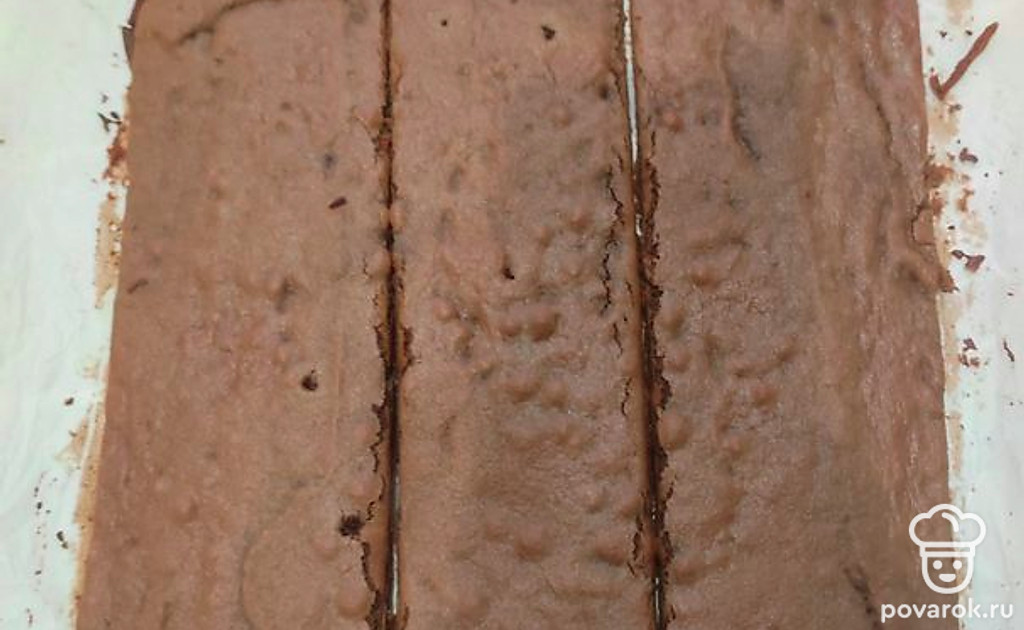 Как только корж испекся, обрезаем края. Режем корж на полосы.
