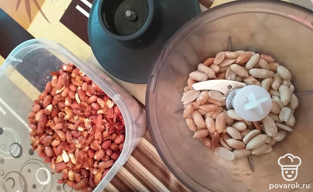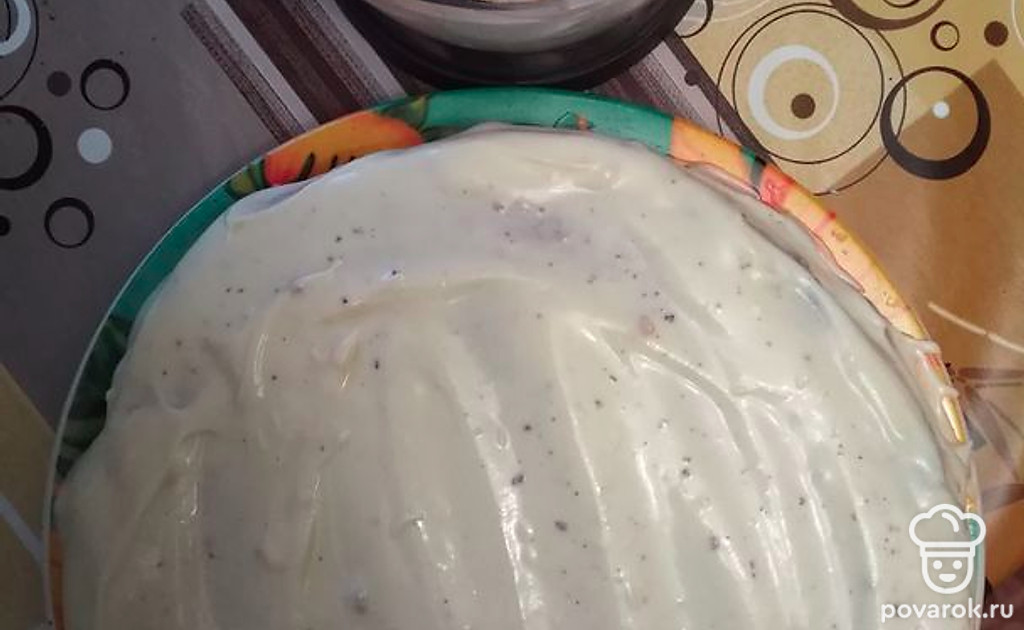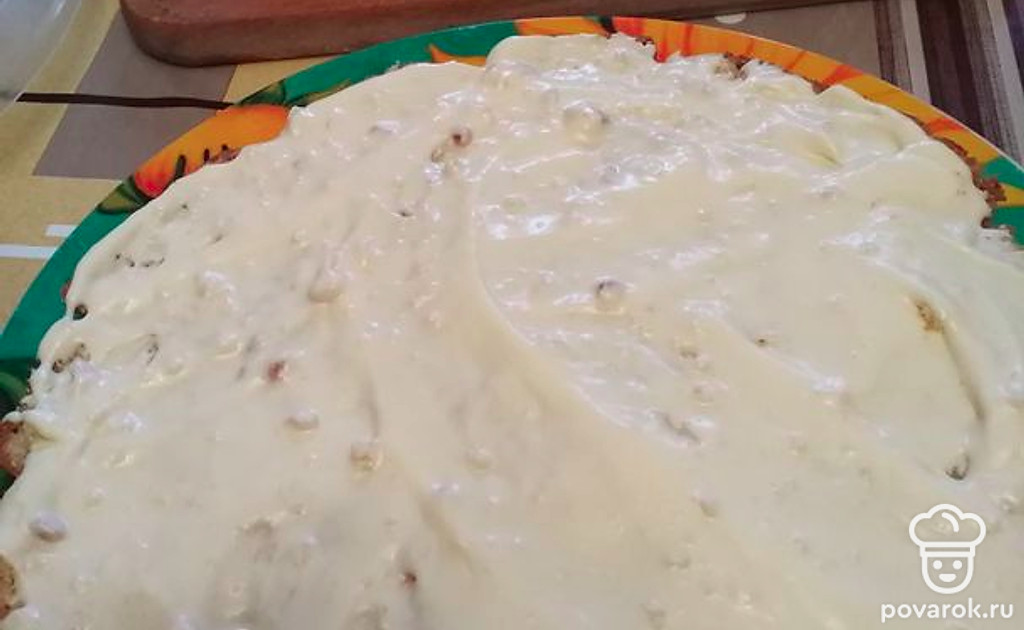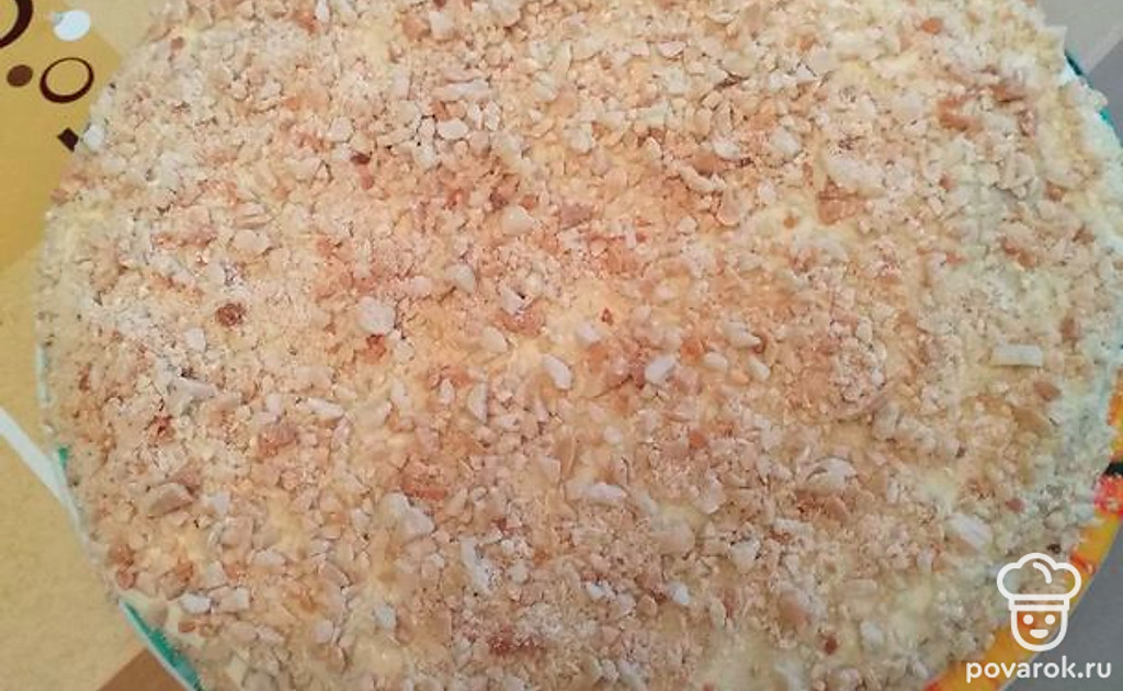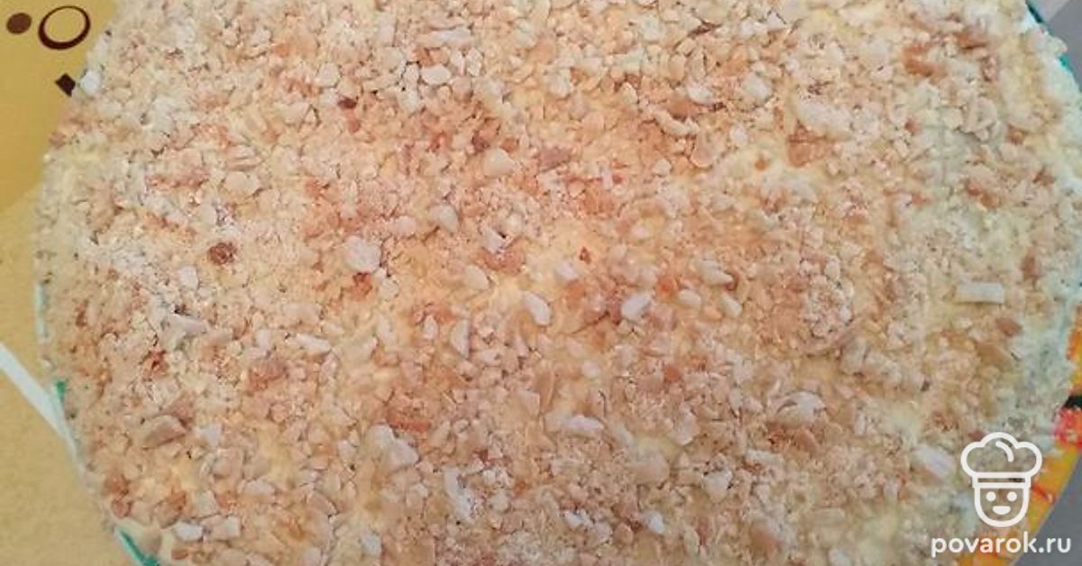 Готовый торт обсыпать по бокам и сверху дробленным арахисом.