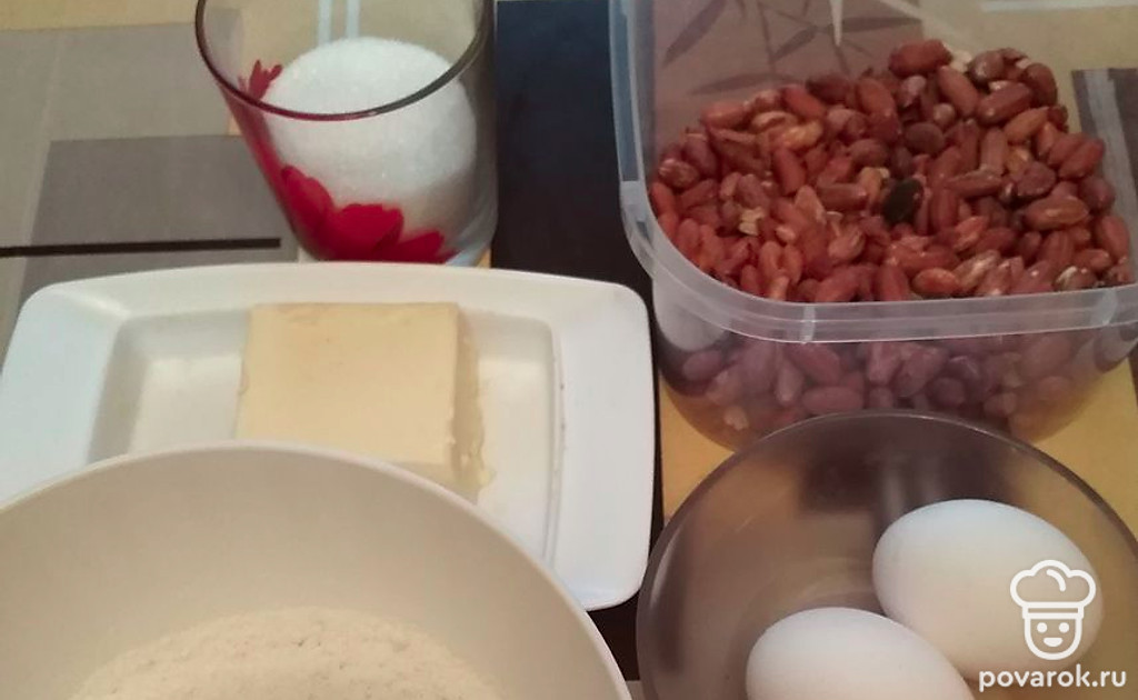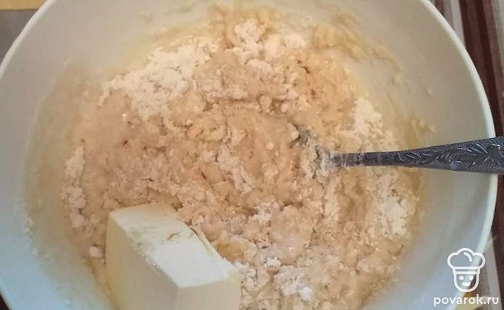 Яйца взбить с сахаром, добавить муку с разрыхлителем и ванилином, вмесить размягченное масло.