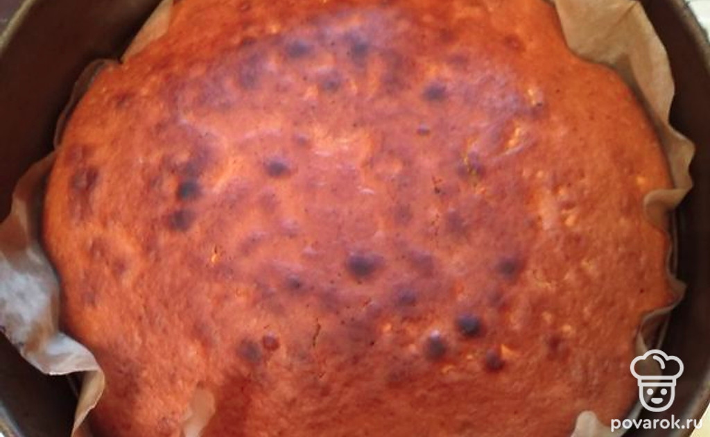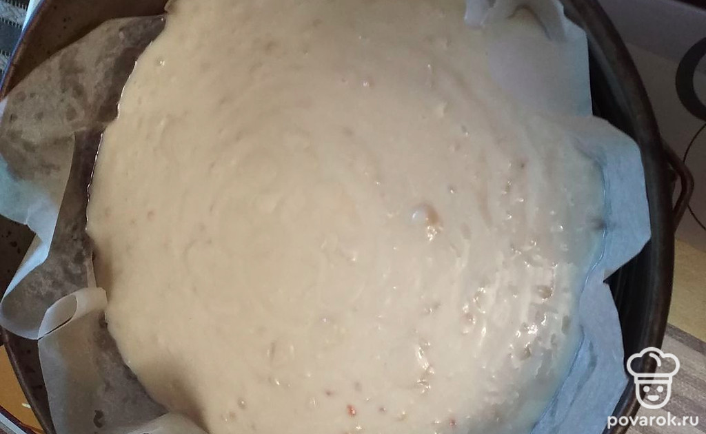 Форму для выпекания выслать пекарской бумагой, вылить жидкое тесто. Отправить в разогретую духовку до 180 градусов. Выпекать до готовности. Диаметр формы 24 см.