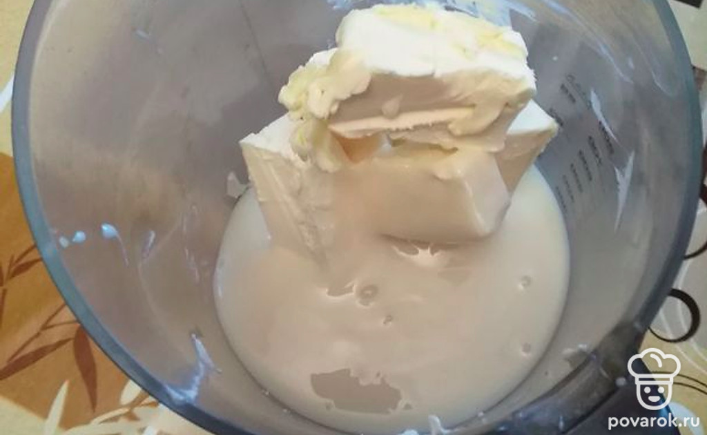 Для крема взбить размягченное сливочное масло 200 г с банкой сгущёнки. Убрать в холодильник готовый крем.