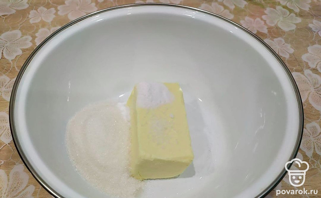 Масло cоединить с сахаром, содой, яйцом и солью. Перемешать.