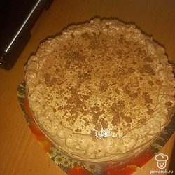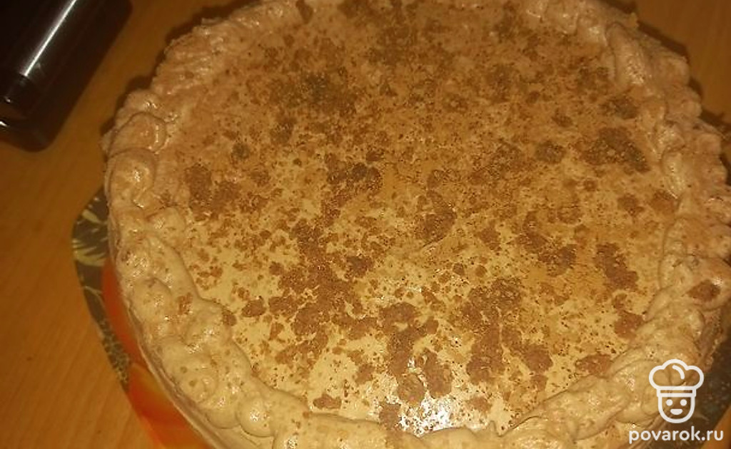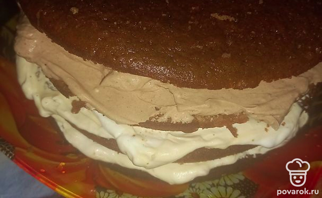 Когда корж остынет, разрежьте его на 3 части. Пропитайте каждый корж из сахара, прокипяченного с водой. Далее смажьте кремом. Сверху также торт обмажьте кремом.