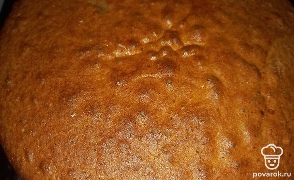 Взбейте яйца, добавьте сметану, какао, гашеную соду и просеянную муку. Тесто должно получится по консистенции, как сметана. Перелейте его в форму и поставьте в духовку на 40 минут при 180 °С. Не открывайте духовку.