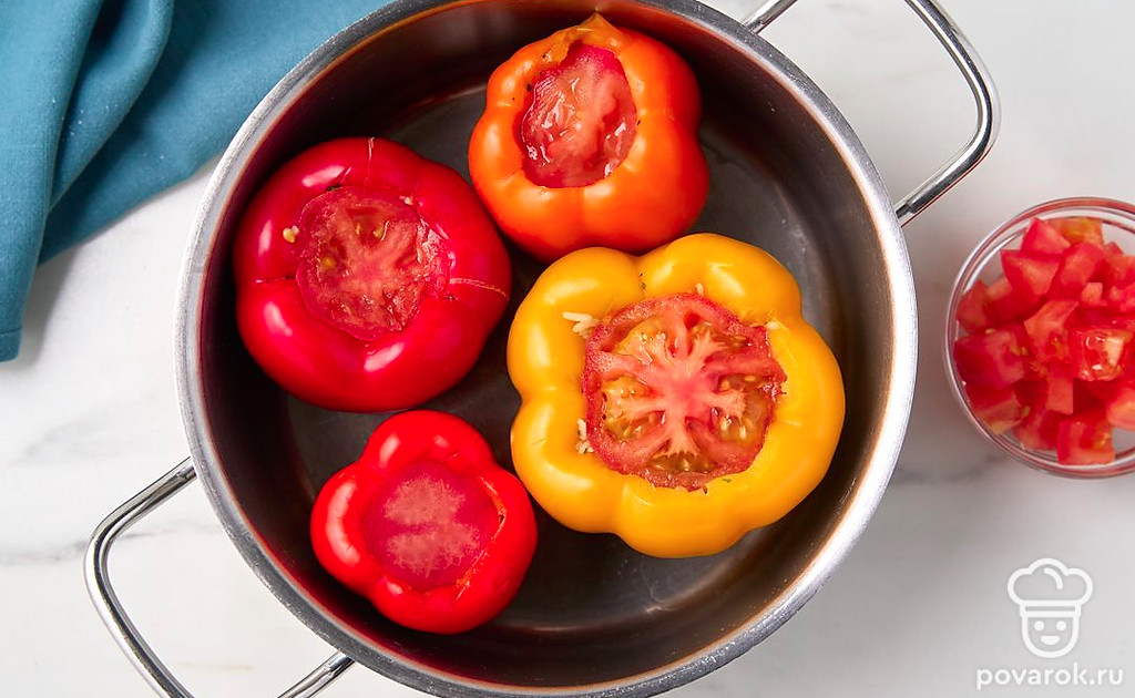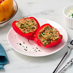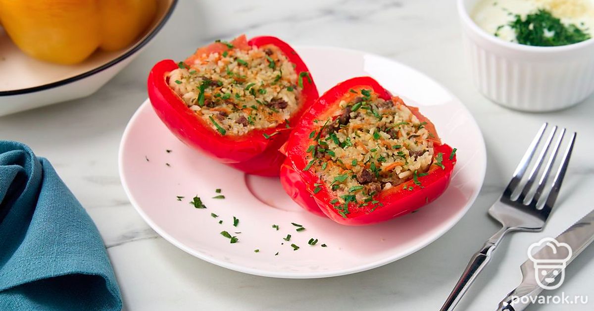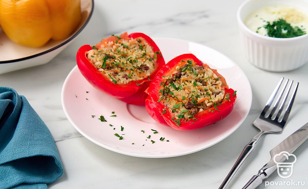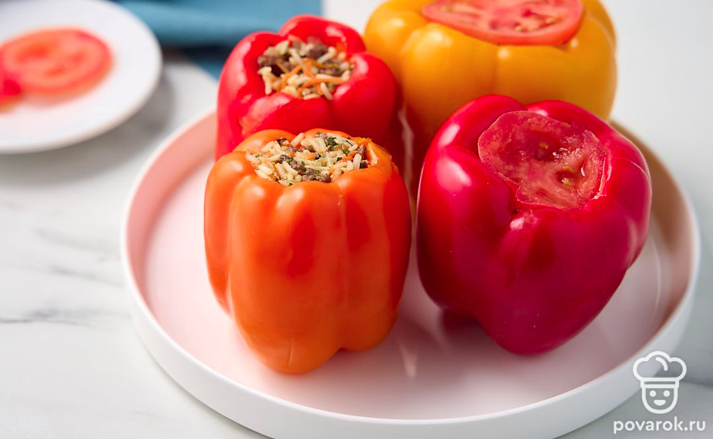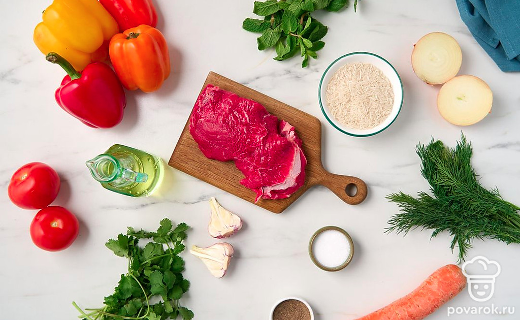Эти ароматные перцы напоминают об отдыхе на Кавказе. Кинза, сочная говядина, рис — все это томится в казане до полной готовности. В результате получается очень вкусное и сытное блюдо на обед или ужин. Так как гарнир уже внутри, то остается только подать перцы с любимым соусом и свежей зеленью. Особенно рекомендуем дополнить блюдо кислым мацони.