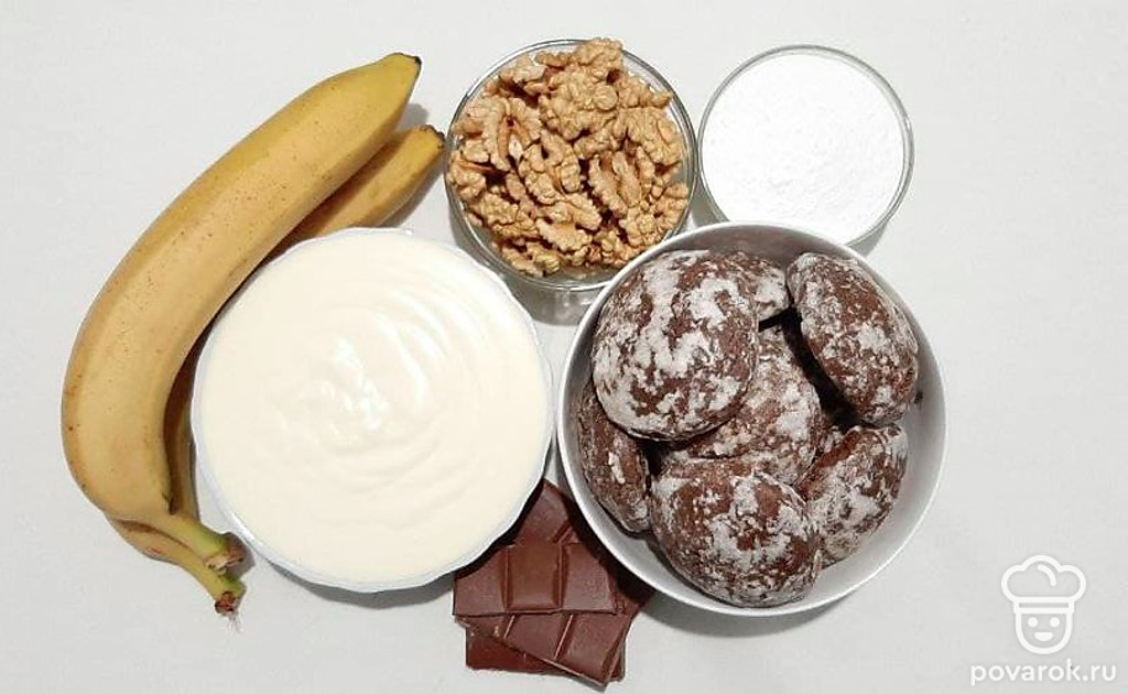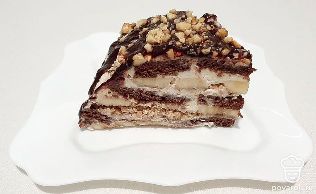 Бананы-это вкусный полезный фрукт. В нем содержится много витаминов и микроэлементов. Витамины группы В, С заряжают энергией. Калий, кальций, фтор, фосфор снижают уровень холестерина, нормализует работу сердца и желудочно-кишечного транспорта. Торт из пряников с бананом-оригинальный десерт, с шоколадным вкусом и нежным сметанным кремом с добавлением бананов и орехов.