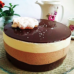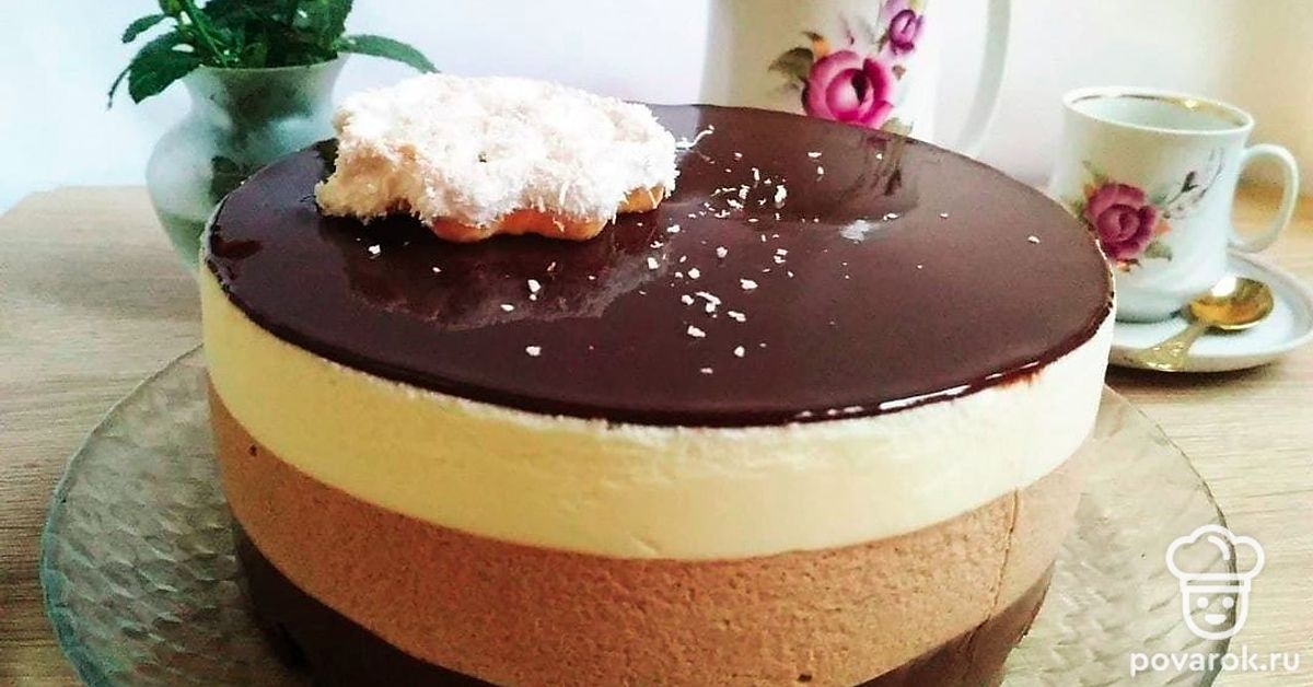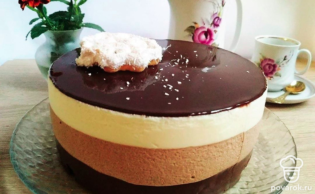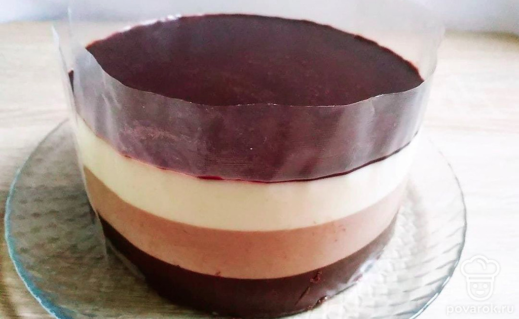 Приготовьте мусс из молочного и белого шоколада по такому же алгоритму, поочередно выливайте их в форму. Оставьте в холодильнике до полного застывания.