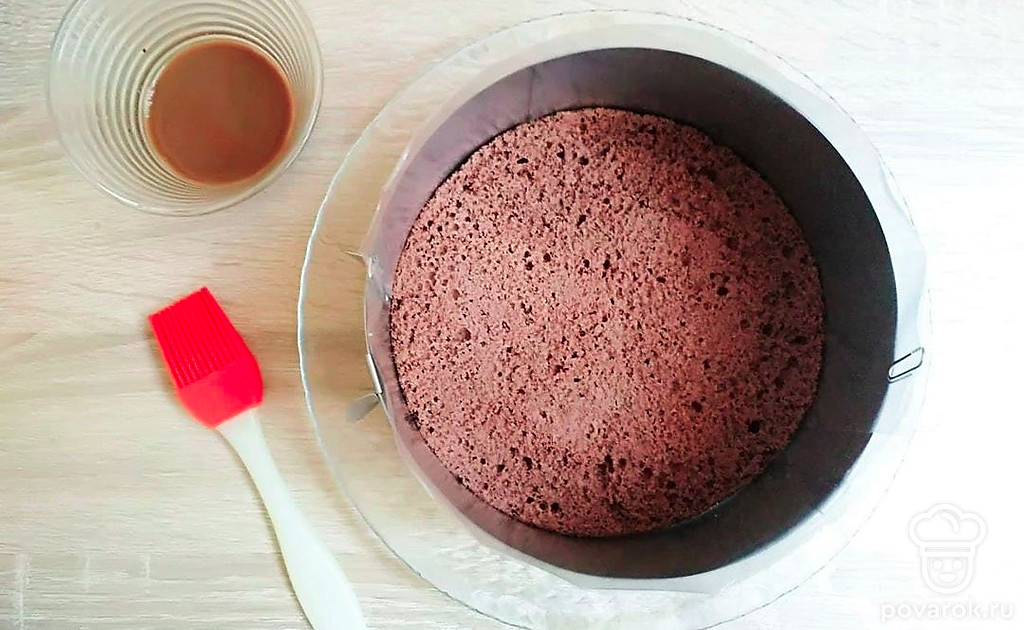 Приготовьте шоколадный бисквит. Взбейте яйца с сахаром до пышности и увеличения массы в два три раза. Постепенно добавляйте в яичную смесь муку, сахар и какао. Перемешайте. Запекайте 30 минут при температуре 180С. Первые 20 минут духовку не открывайте. Готовый бисквит остудите на решетке и обрежьте верхушку. Дно кольца для сборки торта обтяните пищевой пленкой, а бока выложите плотной пленкой. Положите в кольцо бисквит и пропитайте хорошо сиропом.