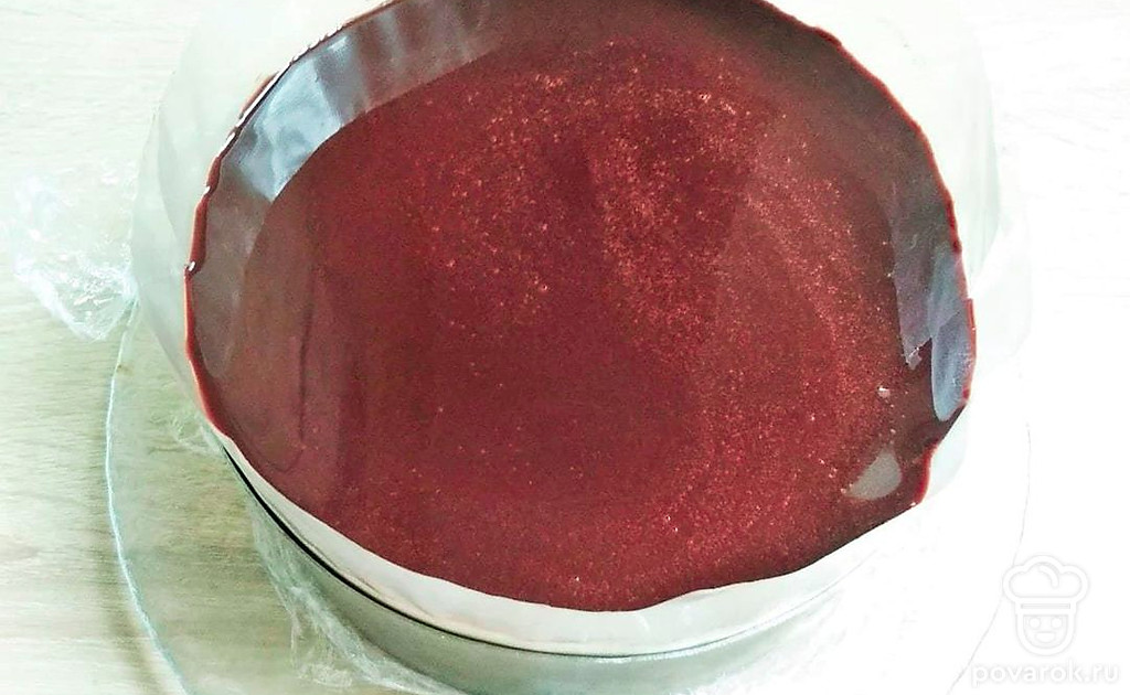 Приготовьте зеркальную глазурь. Смешайте сахар и какао, залейте водой и доведите до кипения. Добавьте растопленный мед, хорошо перемешайте. Снимите сплиты, добавьте желатин, перемешайте до однородности. Остудите до комнатной температуры и залейте сверху торт. Уберите в холодильник для застывания на 2 часа.
