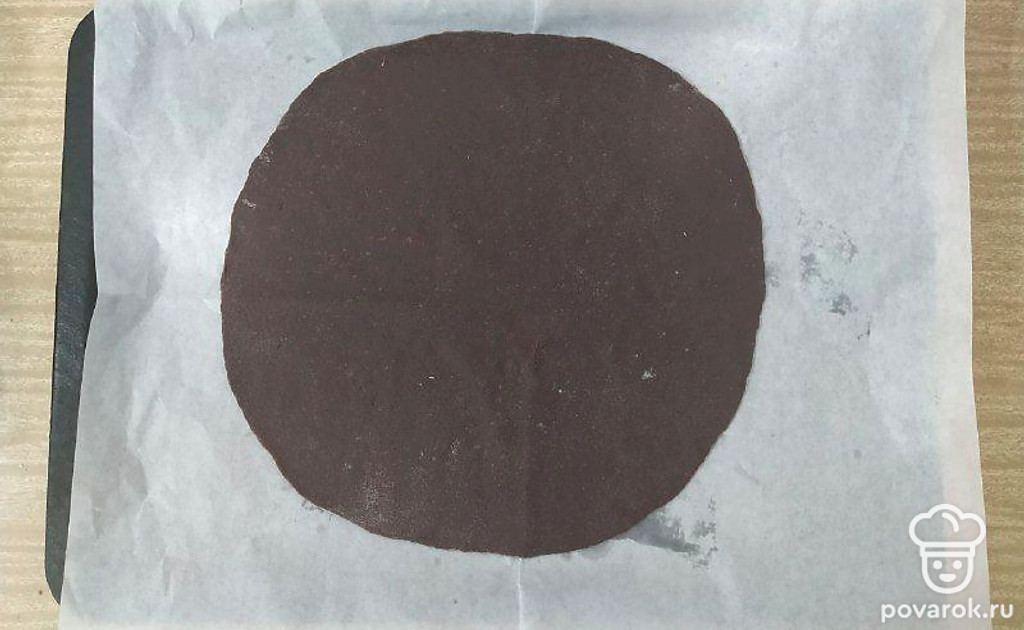 Жидкую смесь вылейте в муку с какао и замесите тесто. Разделите его на 8 или 4 части. Каждый кусок раскатайте в круг и выпекайте в духовке при 180 градусах до готовности (примерно 8 минут).