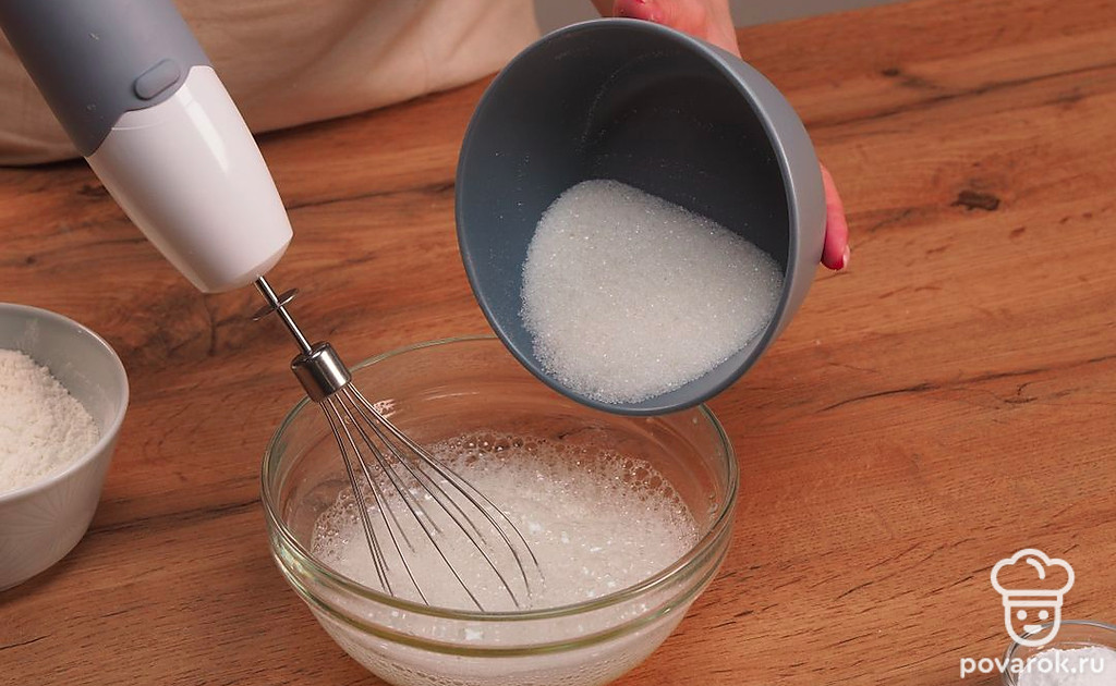 Превратите белки в густую пену. Для этого взбивайте их миксером до тех пор, пока они не станут очень плотными. Добавьте остальной сахар и опять перемешайте.