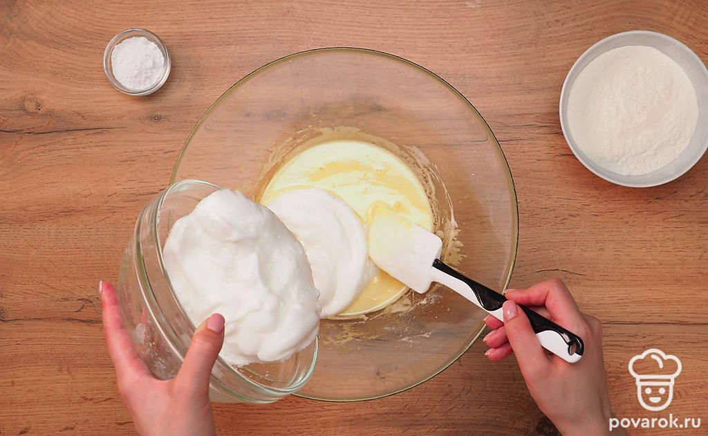 Соедините белки и желтки лопаткой. Перемешивайте не более 30 секунд.